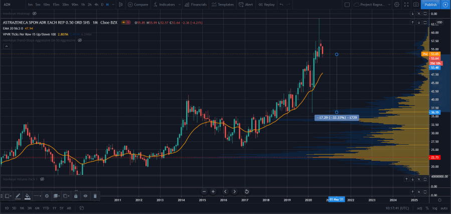 Para el mes de Septiembre AstraZeneca retrocede al momento de publicar esta nota 🔻4.21% y 🔻17.32% desde el máximo de 2020 en 64.94$ por acción, por ende cualquier señal de debilidad en los títulos es probable sea traducido por inversionistas y traders como oportunidades en el corto-plazo para adquirir nuevas posiciones de una empresa que figura como favorita en la carrera de vacunas para derrotar al Covid-19.