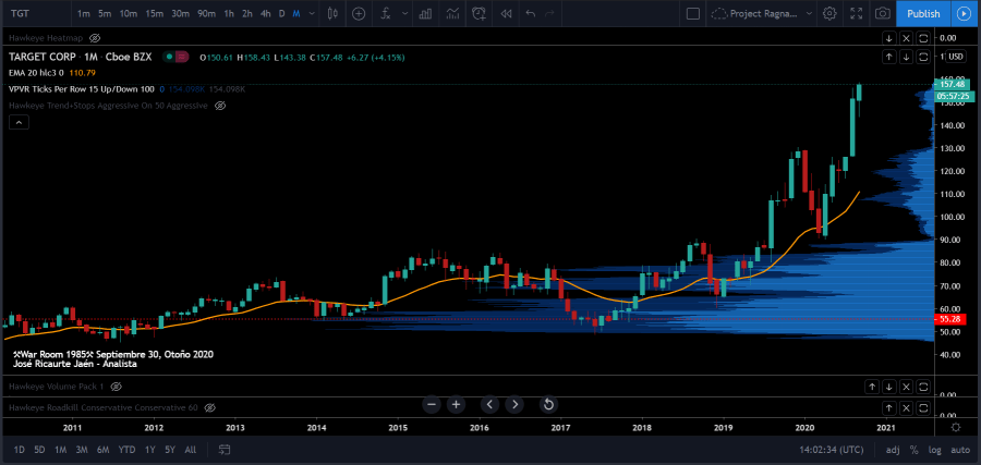 Fundada en Mineapolis, Minesota en 1902, Target (Ticker: TGT) según las estadísticas es la casa minorista No. 6 más grande en los Estados Unidos de Norteamérica y vende una gran variedad de productos desde ropa, alimentos, productos para el hogar, electrónicos y relacionados. Algo clave para el éxito de TGT es todo el enfoque que han tomado durante la pandemia para ofrecer una experiencia de compras segura y conveniente.